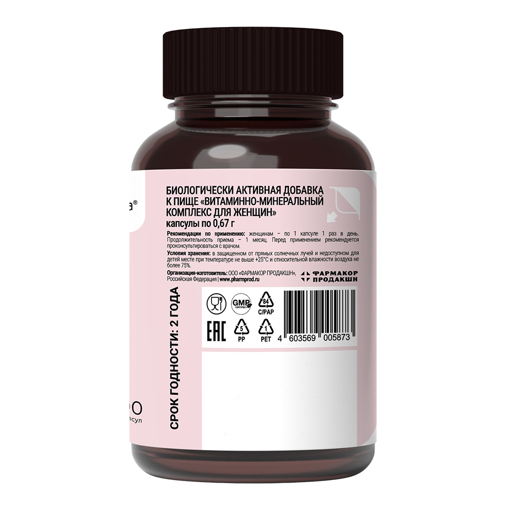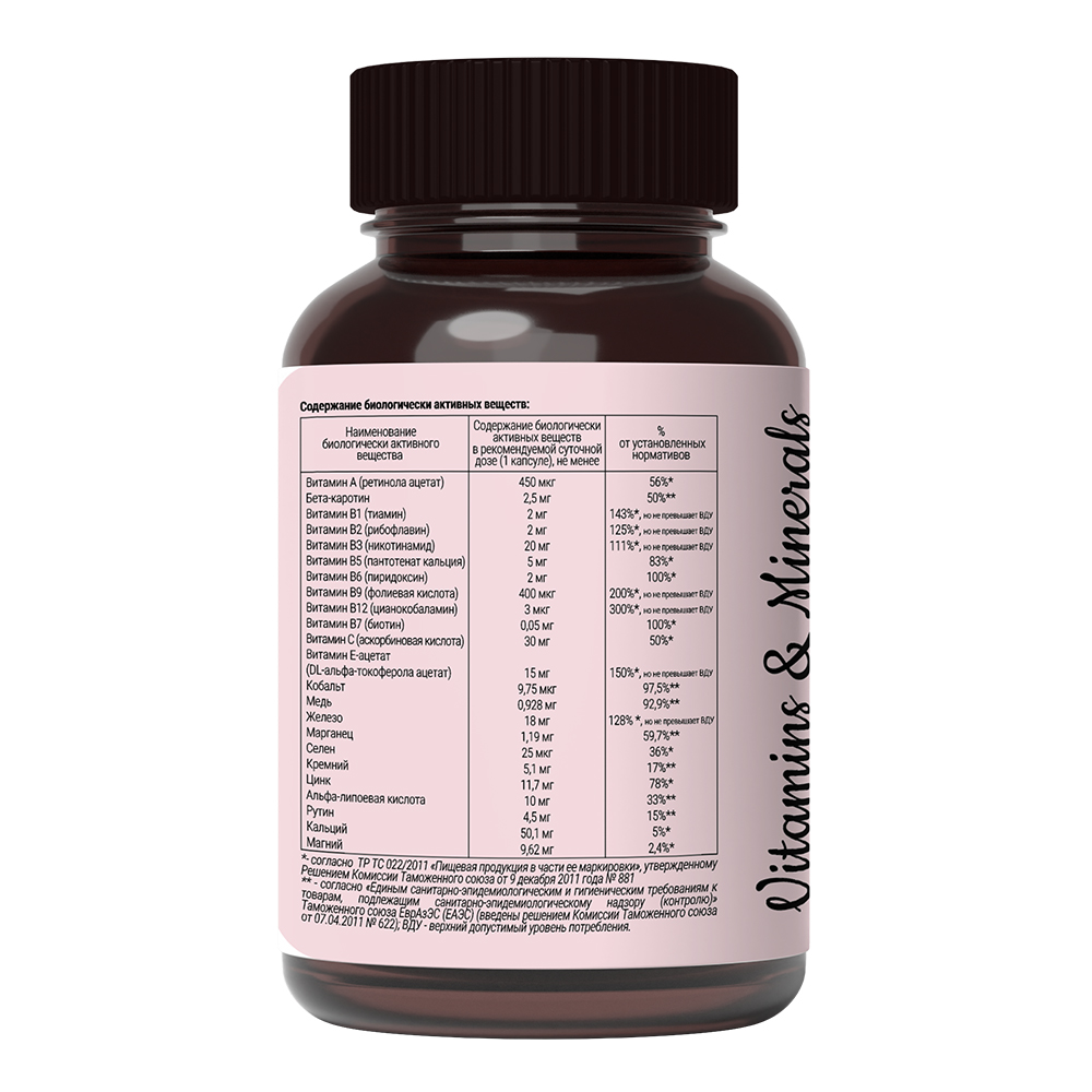 The content of biologically active substances in 1 capsule: Vitamin A (retinol acetate) 450 mcg, Beta-carotene 2.5 mg, Vitamin B1 (thiamine) 2 mg, Vitamin B2 (riboflavin) 2 mg, Vitamin B3 (nicotinamide) 20 mg, Vitamin B5 (calcium pantothenate) 5 mg, Vitamin B6 (pyridoxine) 2 mg, Vitamin B9 (folic acid) 400 mcg, Vitamin B12 (cyanocobalamin) 3 mcg, Vitamin B7 (biotin) 0.05 mg, Vitamin C (ascorbic acid) 30 mg, Vitamin E-acetate (DL-alpha-tocopherol acetate) 15 mg, Cobalt 9.75 mcg, Copper 0.928 mg, Iron 18 mg, Manganese 1.19 mg, Selenium 25 mcg, Silicon 5.1 mg, Zinc 11.7 mg, Alpha lipoic acid 10 mg, Rutin 4.5 mg, Calcium 50.1 mg, Magnesium 9.62 mg,